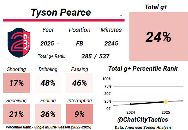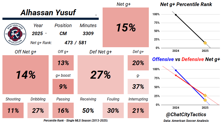 The g+ metrics were brutal to Yusuf this season. Hopefully New England’s internal evaluations say the same, because that’s the path to availability. He’s still a good player, even if this year’s card is covered in red, look at those dots in 2024… and if the Revs are looking to move on, this is a profile worth splashing some cash on.
